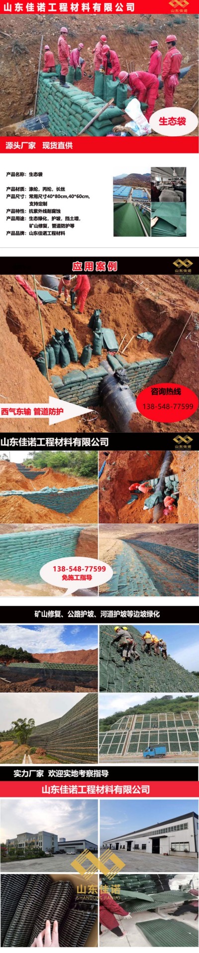 山东佳诺工程材料有限公司专业生产生态袋等护坡材料,常用规格有40*80cm,40*60cm,尺寸支持定制。材质有聚丙烯、长丝、涤纶生态袋等。